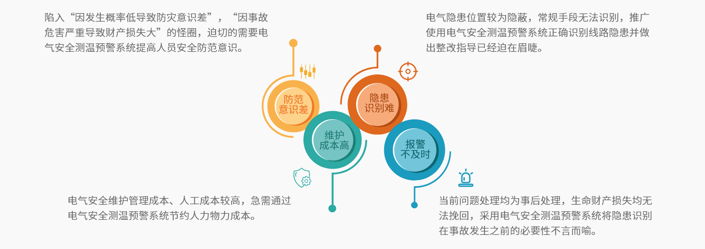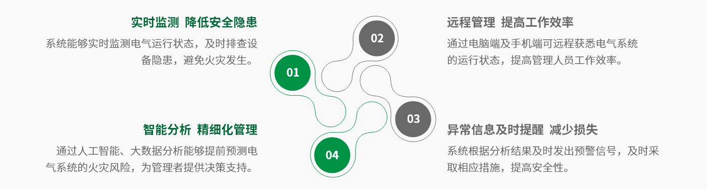 基于云計(jì)算、物聯(lián)網(wǎng)、大數(shù)據(jù)、AI、自取電、超級(jí)功耗等新一代信息技術(shù),對(duì)電氣線路和用電設(shè)備進(jìn)行不間斷的測(cè)量,輔助監(jiān)測(cè)電氣設(shè)備溫度,實(shí)時(shí)發(fā)現(xiàn)電氣線路和用電設(shè)備存在的異常啟停、安全隱患等現(xiàn)象,并對(duì)引發(fā)電氣火災(zāi)隱患進(jìn)行預(yù)警、分析,一旦發(fā)現(xiàn)異常,可即時(shí)向安全管理人員發(fā)送預(yù)警信息,指導(dǎo)其開展隱患治理,達(dá)到消除潛在的消防安全危險(xiǎn),實(shí)現(xiàn)“防患于未然”的目的。
